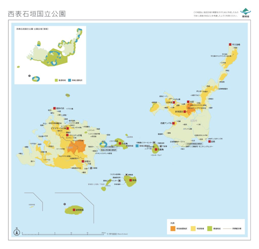 西表石垣国立公園は、琉球諸島の最南端に位置する八重山諸島のうち、西表島、石垣島、西表島と石垣島の間に広がる石西礁湖とその中にある島々、鳩間島、波照間島及びその周辺海域を合わせた公園の総面積は122,155ha(陸域:40,658ha、海域:81,497ha)を公園区域としています。(2024年3月現在)